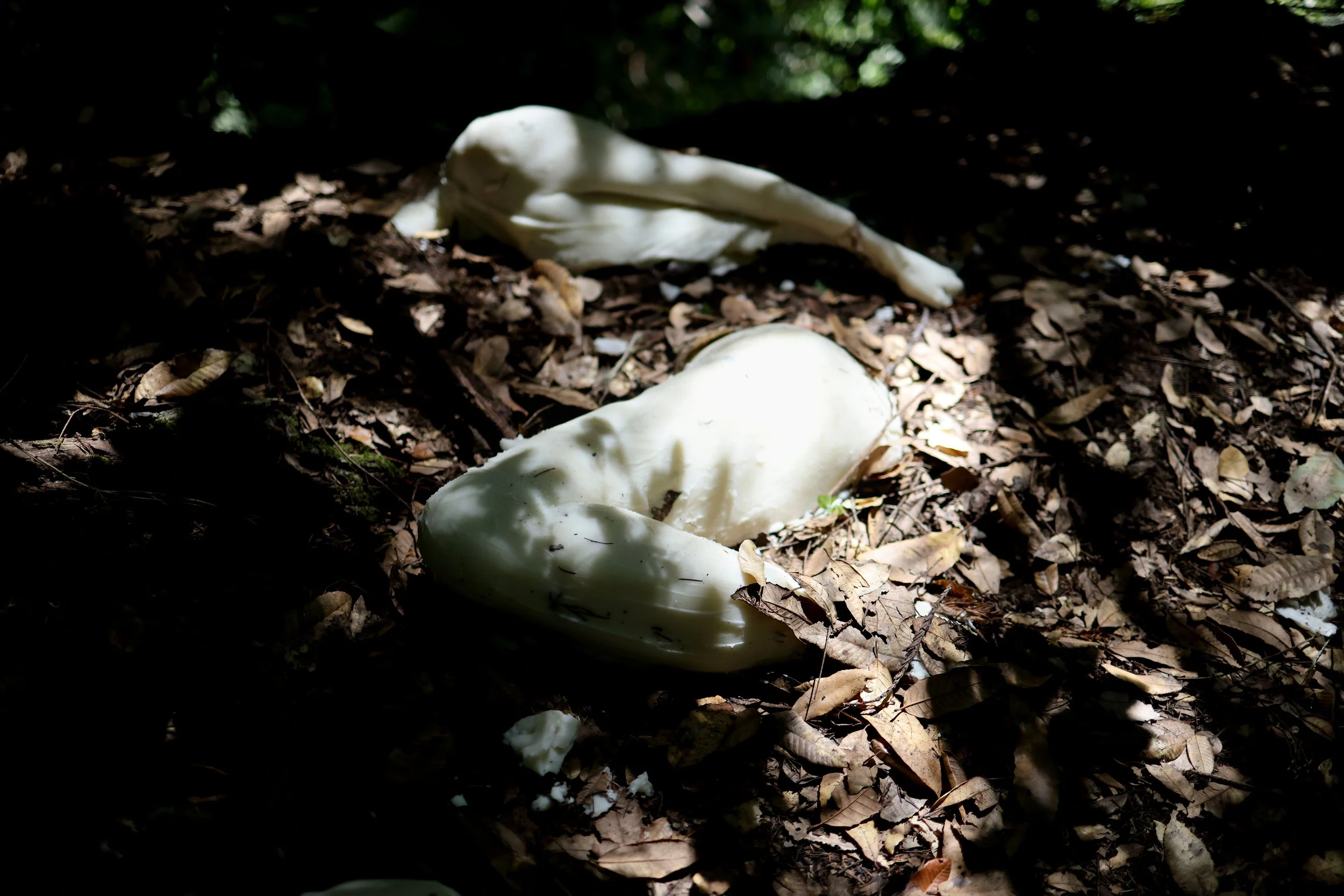The heavy sculptural bodies were then carried into a wooded vacant lot and left there. Cameras recorded the site for weeks to observe whether animals would consume them. They did not.